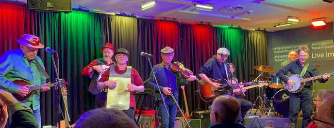 Insgesamt stehen neun Musiker mit Instrumenten wie Akustikgitarre, Schlagzeug, Bass und Waschbrett, aber auch Geige, Mandoline, Akkordeon, Hammondorgel, Banjo und Flöte auf der Bühne.
