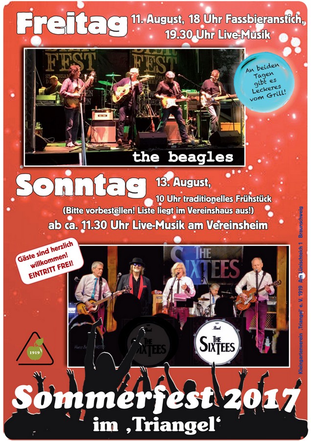 Der Auftritt der beagles beim Sommerfest des KGV "Triangel" in Braunschweig hat trotz Dauerregen viel Spaß gemacht. Das Publikum hat sich von der Musik anstecken lassen und dem Regen getrotzt. Die Band bedankt sich bei den Veranstaltern und hofft auf eine Wiederholung mit Sonnenschein in den nächsten Jahren.
