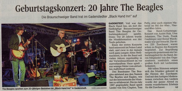 Seit 1997 stehen the beagles nun schon auf der Bühne, das wurde richtig gefeiert: Im ausverkauften Black Hand Inn in Gadenstedt hat die Band am 06. Mai ihr "20 YEARS" Jubiläumskonzert gespielt. Die Stimmung war von Beginn an super und es gab auch gleich vom Kulturverein "Alte Stellmacherei" Geschenke für die 5 beagles, die Jutta Reutling überreichte. Die "Alte Stellmacherei" und die Band verbindet viel, wie Jutta mitteilte, denn seit der Eröffnung 1998 spielten und spielen the beagles dort unzählige Konzerte. Als Überraschung sang danach das Publikum der Band ein Geburtstagsständchen, bevor mit Songs aus 20 Jahren Bandgeschichte losgelegt wurde. Die beagles wurde bei einigen Songs von Burkhard Wittlief an der Percussion und Phil Wiechmann an der Geige unterstützt. Nach 4 Zugaben und über 3 1/2 Stunden beendeten die Musiker ihren Jubiläumsauftritt.