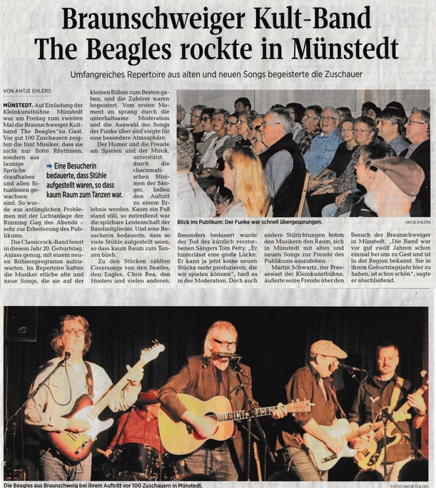 Nach 13 Jahren haben the beagles am 20. Oktober 2017 wieder einmal auf der Kleinkunstbühne in Münstedt gespielt. Das Konzert war mit über 100 Besuchern ausverkauft und der Funke sprang sehr schnell über. Sowohl Publikum als auch die Musiker haben einen tollen Abend in phantastischer Atmosphäre genießen können. Das über 2 1/2 stündige Programm der beagles endete mit einigen Zugaben und sehr viel Applaus. Vielen Dank für die super Organisation und Bewirtung der Band an die Veranstalter der Kleinkunstbühne, dem Heimat- und Kulturverein Münstedt e.V.