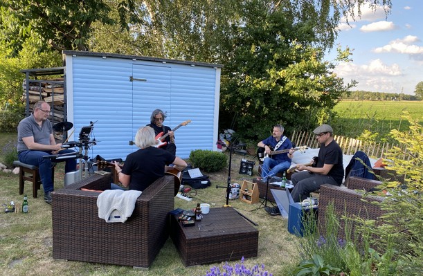 Am Montag war es endlich wieder so weit. Nach 16 (!) Wochen "Corona-Pause" konnte wieder eine gemeinsame beagles-Probe stattfinden. Auch wenn die Auflagen das Musizieren in geschlossenen Räumen vorerst nur für 4 Personen erlauben, so ist es draußen für mehr Personen erlaubt, mit dem nötigen Abstand natürlich. Deshalb trafen sich die 5 Musiker bei Uwe im Garten und da Montag das Wetter auch mitspielte, hatten wir - nach so langer Zeit einsamen Übens zu Hause - wieder richtig viel Spaß am gemeinsamen Musikmachen.