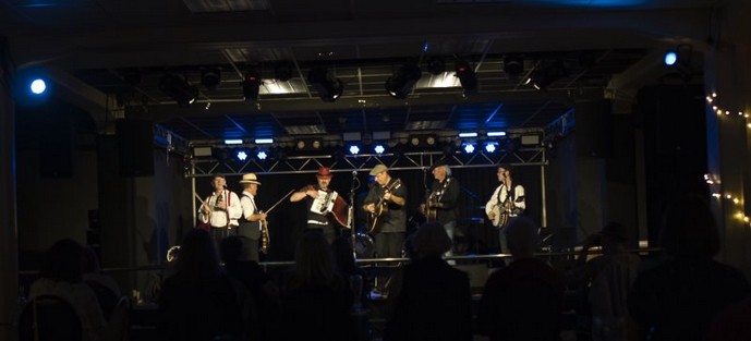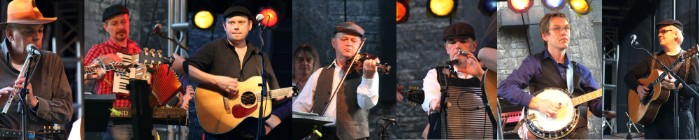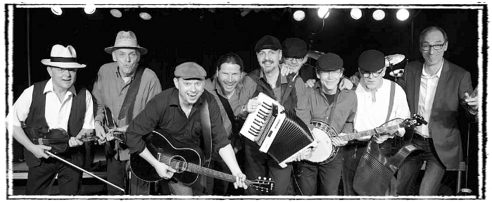Insgesamt stehen neun Musiker mit Instrumenten wie Akustikgitarre, Schlagzeug, Bass und Waschbrett, aber auch Geige, Mandoline, Akkordeon, Hammondorgel, Banjo und Flöte auf der Bühne.